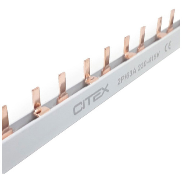 O Barramento Norma DIN tipo Pente/ Pino distribui a alimentação de energia para os disjuntores.Fixação em minidisjuntor. Polos: 2 Comprimento: 1 metro Corrente: 63A Tensão: 415V Suporte em Termoplástico auto-extinguível. Terminais em cobre.Quantidade de terminais: 54