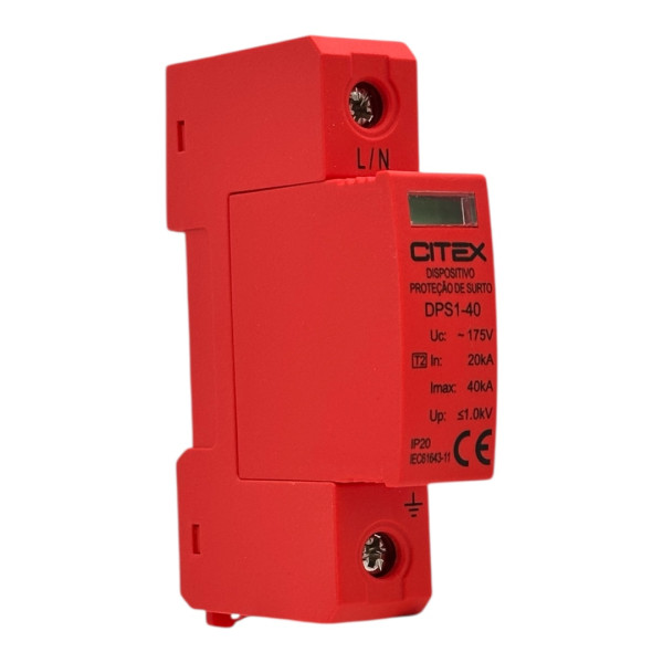 Dispositivo de Proteção contra Surtos (DPS), monopolar, Classe II (IEC 61643-1), do tipo limitador de tensão, composto por Varistor de Óxido Metálico (MOV) associado a um dispositivo de desconexão térmica (sobretemperatura).