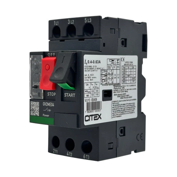 Disjuntor termomagnético de motor Modelo: GV2ME04Quantidade de polos: 3 Capacidade motor:0,12 kW a 400/415 V CA 50/60 Hz 0,18 kW a 400/415 V CA 50/60 Hz 0,37 kW a 690 V CA 50/60 Hz Capacidade de corte:100 kA Icu a 230/240 V CA 50/60 Hz para IEC 60947-2 100 kA Icu a 400/415 V CA 50/60 Hz para IEC 60947-2 100 kA Icu a 440 V CA 50/60 Hz para IEC 60947-2 100 kA Icu a 500 V CA 50/60 Hz para IEC 60947-2 100 kA Icu a 690 V CA 50/60 Hz para IEC 60947-2 [In] corrente nominal: 0,63AFaixa de ajuste: 0.40-0.63A[Ui] tensão de isolamento nominal: 690 V CA 50/60 Hz conforme IEC 60947-2[Uimp] tensão nominal suportável de impulso: 6 kV IEC 60947-2grau de proteção IP: IP20Temperatura ambiente para armazenamento: -40…80 °CTemperatura ambiente do ar para funcionamento: -20…60 °Ctorque de aperto: 1,7 N.m