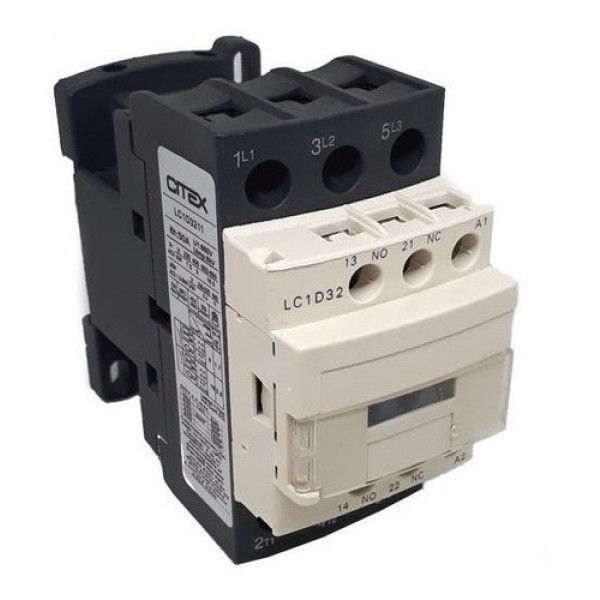 Contator tripolar, com 2 contatos auxiliares sendo 1 NA e 1 NF.